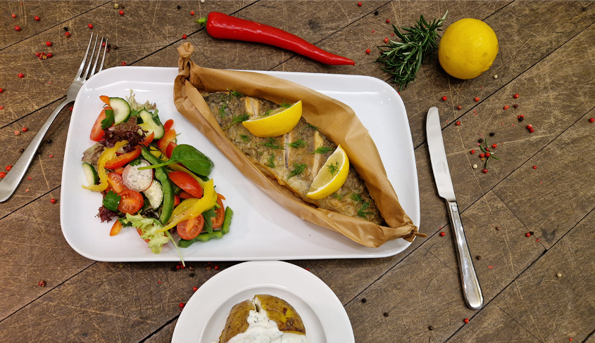Pstrąg w całości z pieca ziemniak pieczony z dipem, świeża sałatka 69 zł